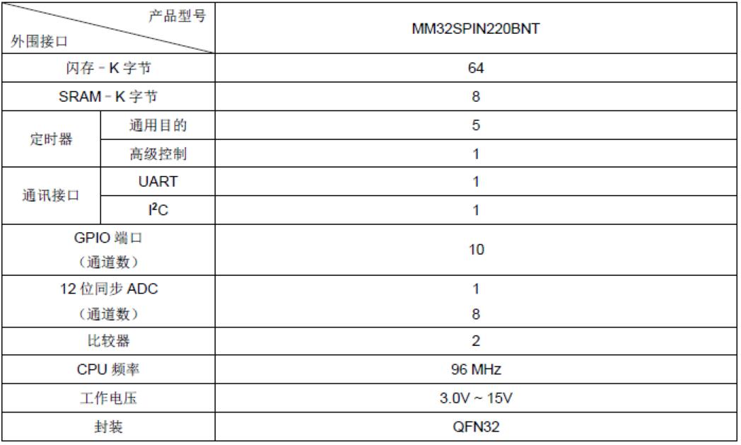 MM32SPIN220B產品提供QFN32封裝形式;下面給出了該系列產品中所有外設的基本介紹。