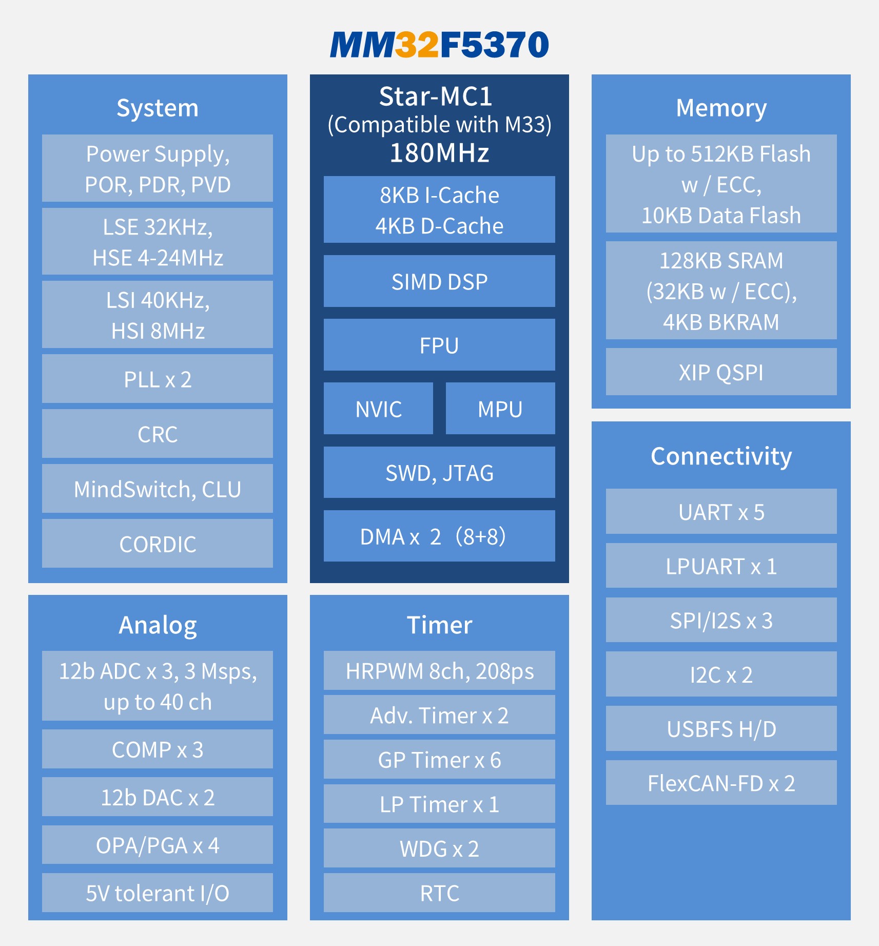 MM32F5370搭載國(guó)產(chǎn)Star-MC1內(nèi)核,基于Armv8-M架構(gòu),指令集兼容Cortex-M33,提供高達(dá)512KB flash,支持ECC,并提供分區(qū)讀保護(hù),支持代碼二次開(kāi)發(fā),保護(hù)方案商利益;另有10KB Data Flash,獨(dú)立分區(qū)。提供高達(dá)128KB SRAM,其中32KB支持ECC;另有4KB retentionRAM,可在Standby模式下對(duì)數(shù)據(jù)進(jìn)行保持。提供QSPI外部存儲(chǔ)擴(kuò)展接口,并支持XIP。該型號(hào)滿足三電機(jī)應(yīng)用的實(shí)時(shí)控制需求。
