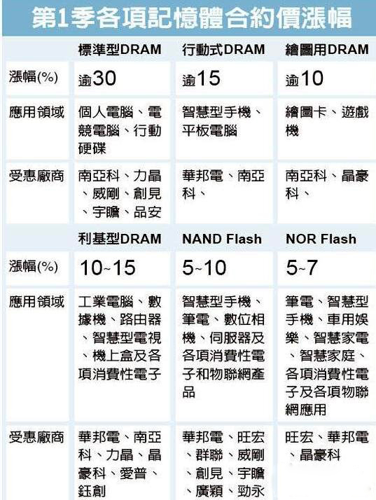 今年存儲(chǔ)芯片缺貨效應(yīng)持續(xù)擴(kuò)大,繼DRAM、儲(chǔ)存型快閃存儲(chǔ)(NAND Flash)在淡季飆出歷年最大漲幅后,編碼型快閃存儲(chǔ)(NOR Flash)也在睽違四年多來(lái)初次提價(jià),第一季度調(diào)漲5~7%不等,下季漲幅更大,估計(jì)漲幅逾10%。