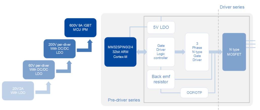 SPIN是旋轉(zhuǎn)的同義詞,再注入靈動微電子的靈魂Mind,表示靈活與專業(yè)。包含了三大主軸:專業(yè)MCU,專用驅(qū)動MCU微控制器及解決方案平臺。專用MCU的獨特之處是帶領(lǐng)了許多主流應(yīng)用,如:電動車的應(yīng)用,目前市場的占有率仍然保持領(lǐng)先地位;專用驅(qū)動型MCU微控制器電壓范圍從20V至600V。例:MM32SPIN222C集成了三相MOSFET、預(yù)驅(qū)以及LDO,可讓小空間發(fā)揮最大的功能,同時內(nèi)建了高性能32位的Arm Cortex-M0內(nèi)核為運算核心,讓開發(fā)更為簡單快捷;解決方案平臺由擁有超過10年以上算法開發(fā)經(jīng)驗的MindSPIN團(tuán)隊精心打造,按技術(shù)方式分為方波、旋波FOC以及位置控制三類,按應(yīng)用方式可分為風(fēng)機、電動工具、微電機、家電以及電動車五大類,同時靈動微電子還提供了不同的相對應(yīng)的特色