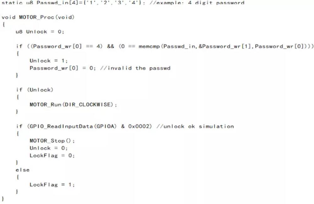 在MOTOR_Proc()處理函數(shù)中針對藍(lán)牙接收到的密碼數(shù)據(jù)進(jìn)行解析,如果與默認(rèn)設(shè)置的4位0-9數(shù)字密碼完全匹配上則操作解鎖,將DC馬達(dá)按照設(shè)定方向控制運(yùn)轉(zhuǎn),為了簡易驗(yàn)證,模擬一個信號表示解鎖成功,這里是通過采集指定IO引腳PA1的輸入來實(shí)現(xiàn),采集到輸入為高電平那么停止DC馬達(dá)轉(zhuǎn)動,且清零鎖定標(biāo)志位。以下為代碼實(shí)現(xiàn)內(nèi)容: