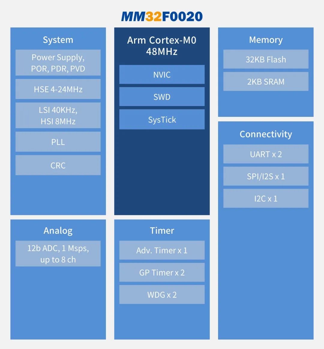 靈動微MM32F0020B1T使用高性能的Arm®Cortex®-M0為內核的32位MCU,搭載48兆赫茲,內置32KB Flash和2KB SRAM的高速存儲器,具有豐富的增強型I/O端口和多種外設。包括1個12位的ADC,1個16位通用定時器、1個16位基本定時器、1個16位高級定時器,2個UART接口、1個SPI接口和1個I2C接口。