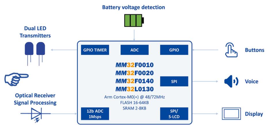 -MM32L0130集成了段碼LCD控制器,且待機功耗可低至100nA,可進(jìn)一步降低血氧儀的整體功耗,實現(xiàn)更長久和易用的用戶體驗
