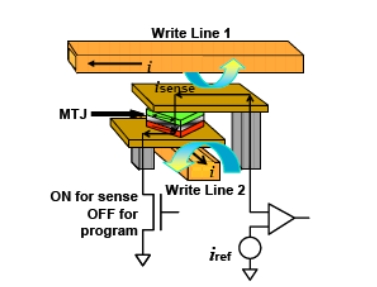 實現MRAM可靠存儲的一個主要障礙是高位干擾率。對目標位進行編程時,非目標位中的自由層會被誤編程。目前飛思卡爾半導體研究人員已經成功解決了此問題,其方法是,在每次出現位狀態空翻時,產生一個跳變位,它將磁矩的方向旋轉到同一方向。寫入線1和寫入線2上的反轉脈沖電流使極性旋轉,從而不會干擾相同行或列的其它位元。